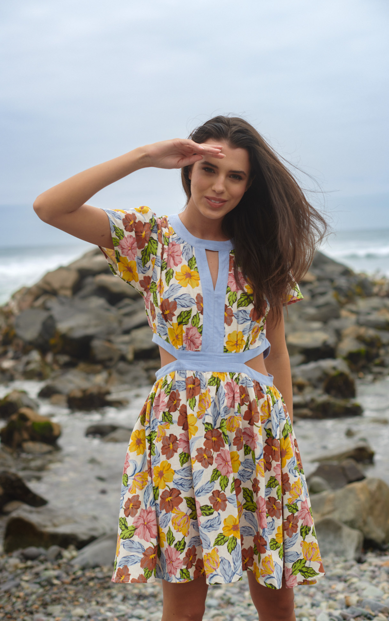 El vestido Perla es muy romántico pero moderno por las aberturas que tiene en los costados y el escote en V en el pecho, este tiene aplicaciones del mismo tipo de tela pero en el color que predomina la tela estampada del cuerpo del vestido, también tiene cortes y pinzas en distintas partes para que arme mejor . Las mangas son cortas y abuchonadas para que se vea más romántico .Es un vestido corto con mucho vuelo ya que tiene tela corrugada a la altura de la cintura para generar movimiento.